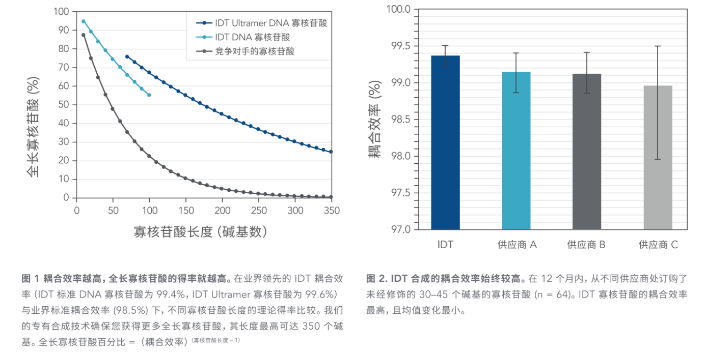 所有单链和双链序列均采用业界领先的耦合效率制备,使生成的DNA序列品质更高。采用IDT专有技术,可以制备优质的Ultramer"DNA寡核苷酸,这是一种长达200个碱基的长寡核苷酸。(图1-2)。