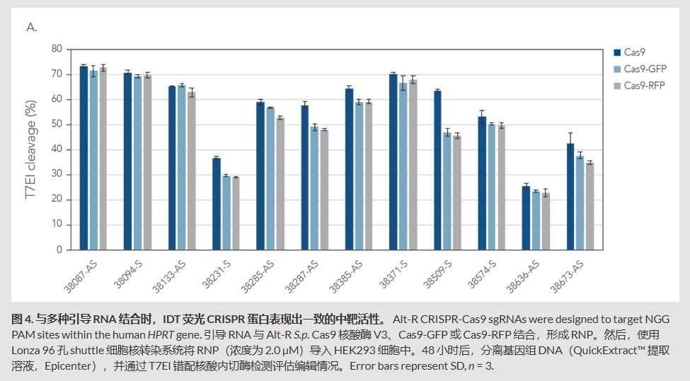 IDT's Alt-R S.p.Cas9-GFP and Alt-R S.p.Cas9-RFP nucleases maintain consistent on‑target activity.