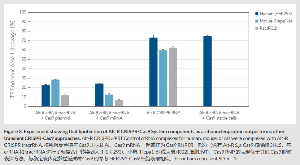 Alt-R CRISPR-Cas9系统含有强效的Alt-R S.p.Cas9核酸酶。当Alt-R S.p.Cas9核酸酶3NLS与Alt-R CRISPR crRNA和tracrRNA结合形成核糖核蛋白(RNP)时,该系统的表现优于其他编辑方法(图3)。使用Alt-R S.p.Cas9核酸酶V3可以获得更高的编辑效率(参见图2)。RNP转染还对所用编辑复合物的量进行了控制,不可再生的 Cas9 RNP在短时间内被内源性机制清除,有效减少了脱靶编辑。