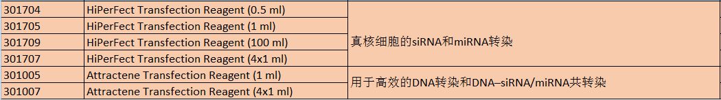 Attractene 新一代转染试剂 对广泛类型的细胞效率高,极低毒性,可同天铺细胞和转染,用量少,价格更经济。HiPerFect 针对siRNA和miRNA的转染试剂阳离子和中心脂质分子,可高效释放 siRNA是miRNA的理想转染试剂。